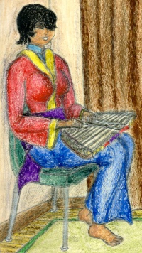 因為畫家對中國女人有興趣﹐他常畫這樣的畫兒。畫家的本來的意思是畫一位彈洋琴手。但是﹐因為在那個時候他是不知道的﹐他畫錯了。洋琴是用音錘彈﹐但是﹐他畫這個彈洋琴手用手指彈﹔Whoops!!! 啊﹗就是他吧!|